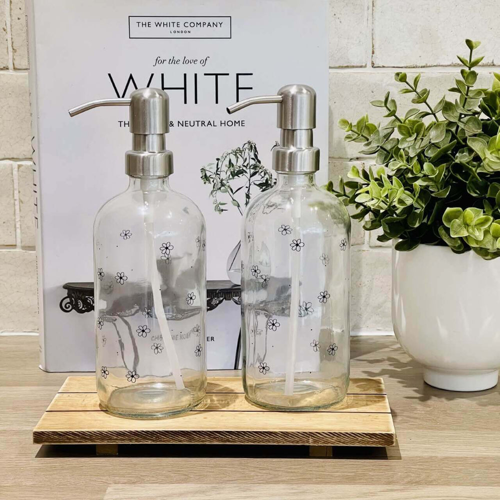 This set of two glass pump bottles by Pretty Little Home feature a stunning black floral design and comes with both matte black and silver stainless steel tops options. Perfect for handwash and liquid lotion, they are perfect for adding a decorative touch to your home while providing the convenience of easy-to-use pump dispensers.