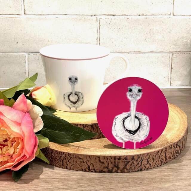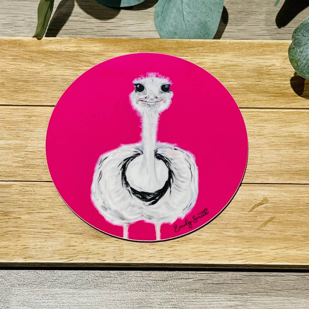 Coaster - Camilla is a top of the line luxury coaster made with melamine with a velvet baize backing, plus the unique and vibrant design of Camilla the Ostrich by Emily Smith Designs. A must-have for anyone looking for superior protection and stylish design.