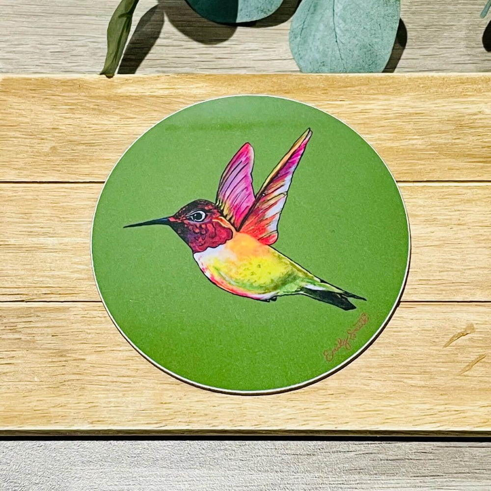 Coaster - Hermione is a top of the line luxury coaster made with melamine with a velvet baize backing, plus the unique and vibrant design of Hermione the Hummingbird by Emily Smith Designs. A must-have for anyone looking for superior protection and stylish design.