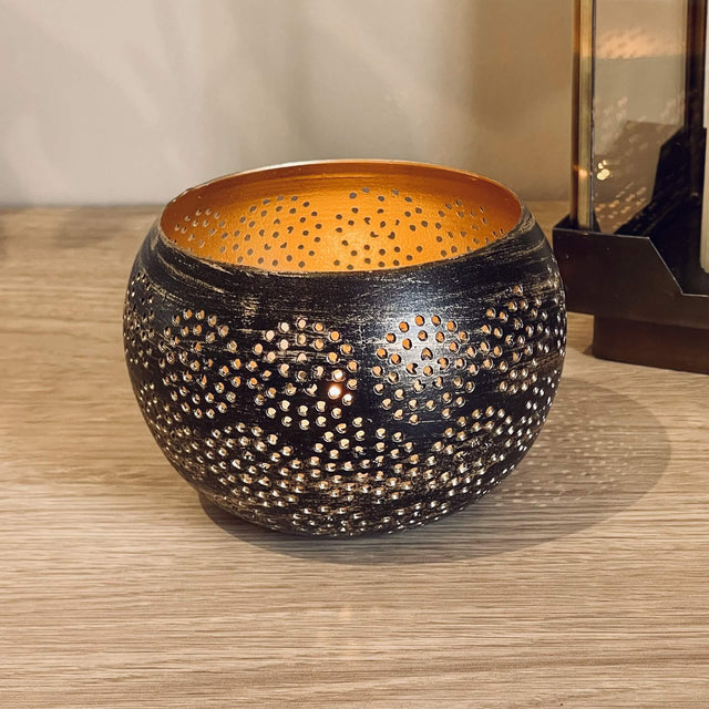 This beautiful little tea light holder is expertly crafted from recycled metal. Finished with patterned cut out details and a gold paint on the inside, it gives a warm glow to cosy nights. Ideal as a new home or just-because gift.