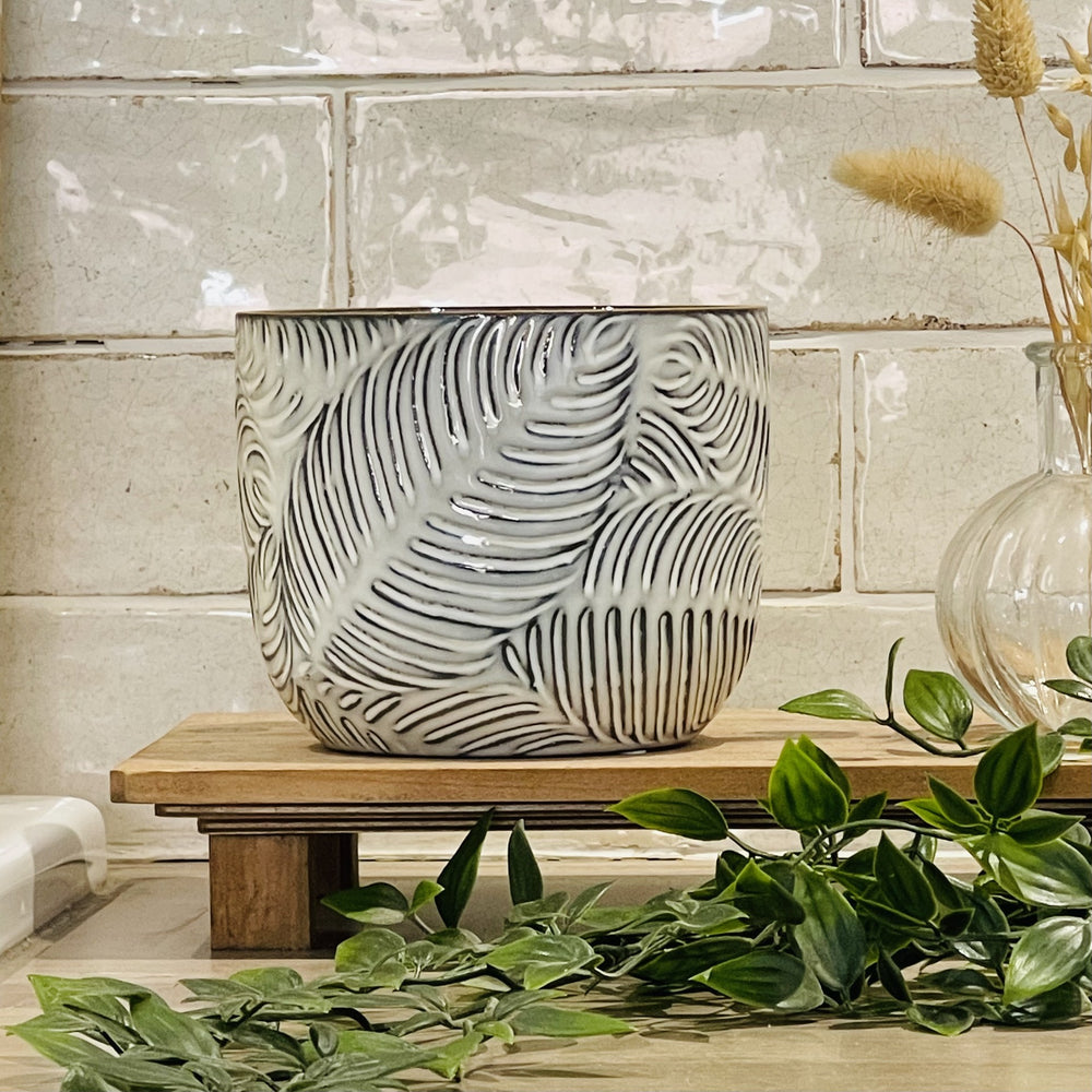 Enhance the aesthetic appeal of your home with this exquisitely crafted ceramic plant pot, showcasing a delicate leaf design. This intricately detailed pot adds a charming touch to any space while infusing a natural element into your interior decor.