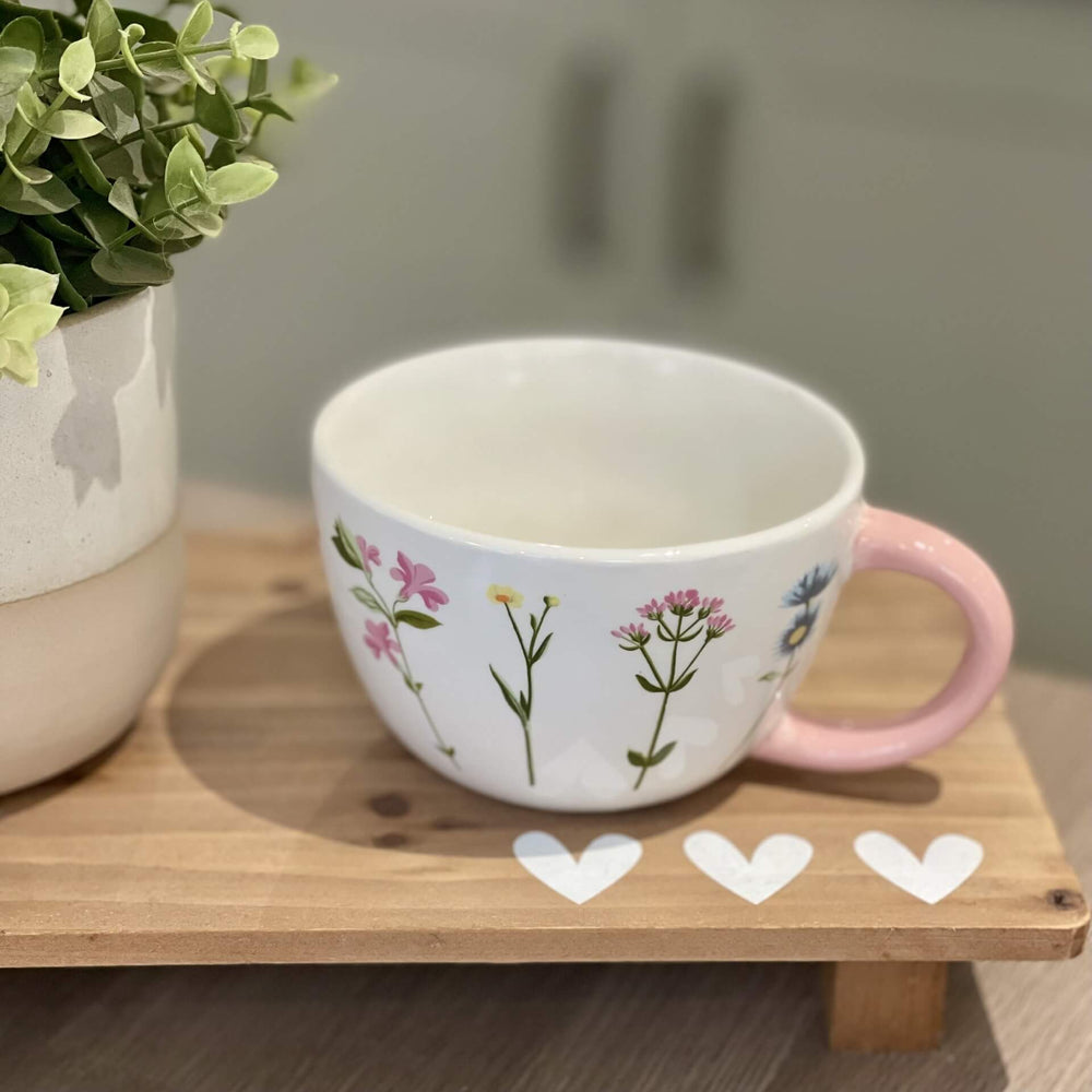 Infused with the vibrant beauty of spring blooms, this elegant ceramic mug features a timeless countryside design. Its delicate pale pink handle perfectly complements the charming floral print, makes for an ideal gift and a beautiful addition to your mug collection.