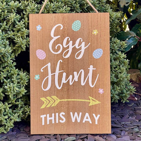 This wooden hanging sign, is the perfect addition to any Easter celebration. Whether for family gatherings or community events, it features a fun design with directions to the egg hunt, adorned with pastel eggs and flowers. It's a must-have for Easter gifts and home decor.